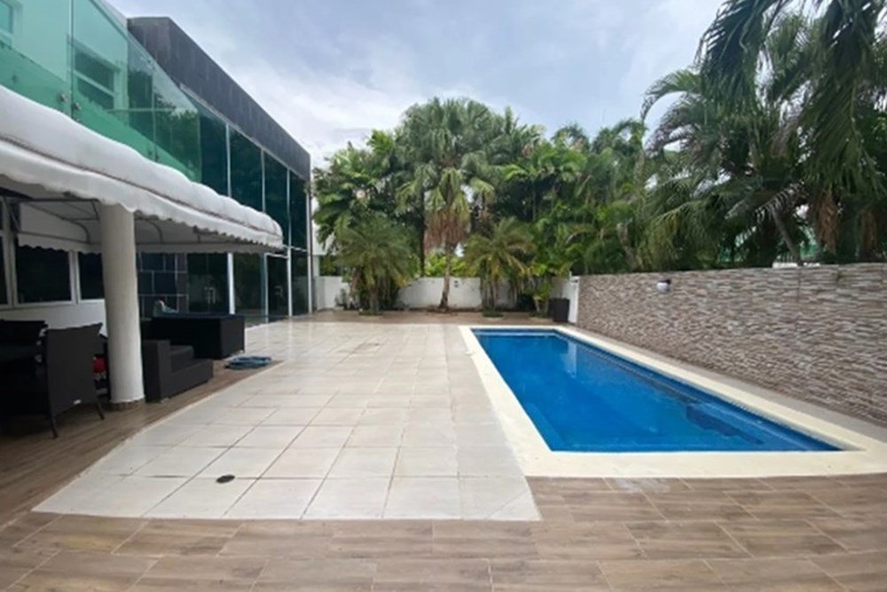 Piscina privada con terraza en el primer nivel, rodeada de áreas verdes y palmeras